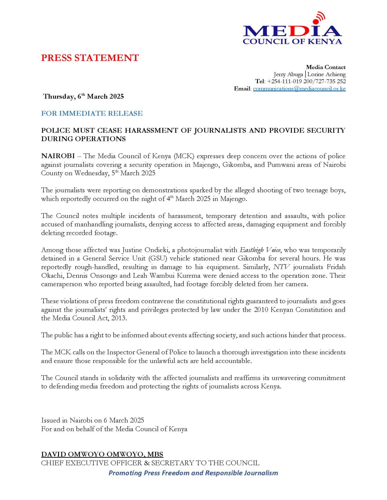 The Media Council of Kenya (MCK) has decried a continuing trend by police to harass journalists. In a press statement on March 6 2025, the council’s chief executive officer David Omwoyo Omwoyo said it had noted multiple incidents of harassment, temporary detentions and assault of journalists covering live protests and security operations.